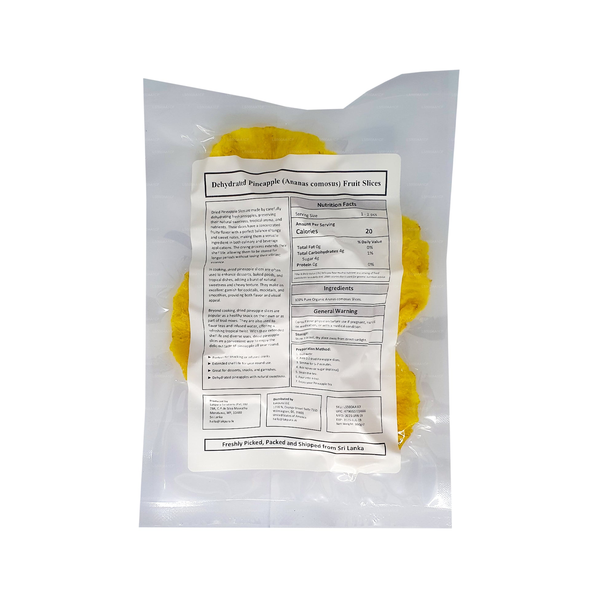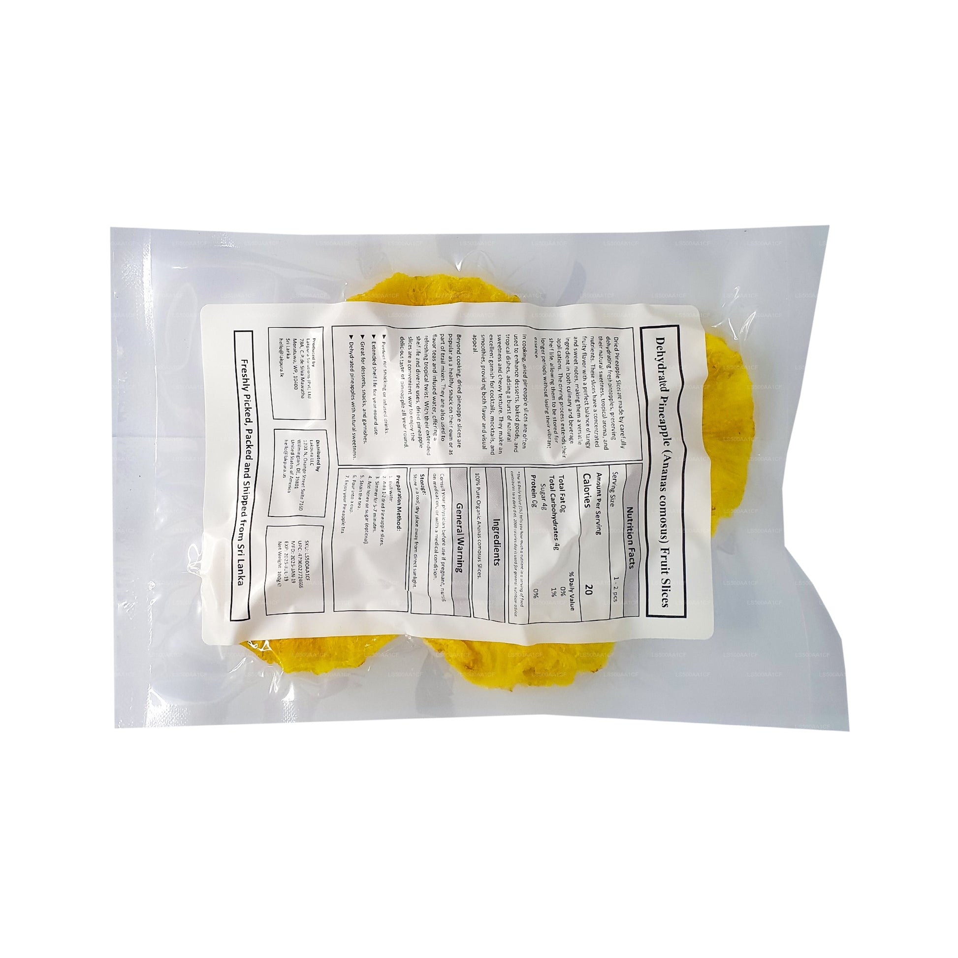 Naše dehydrované přírodní ananasové plátky Lakpura vám slibují 100% ananas a nic víc, jsou skvělým občerstvením pro všechny věkové kategorie. Plátky jsou dodávány bez přidaného cukru, zatímco my vás ujišťujeme, že žádné umělé příchutě a barviva z nich činí výživný doplněk vaší stravy. Tyto sušené plátky ananasu se sbírají v dokonalé zralosti a dehydratují při nízkých teplotách, aby byl zachován nutriční obsah a pravá barva neporu