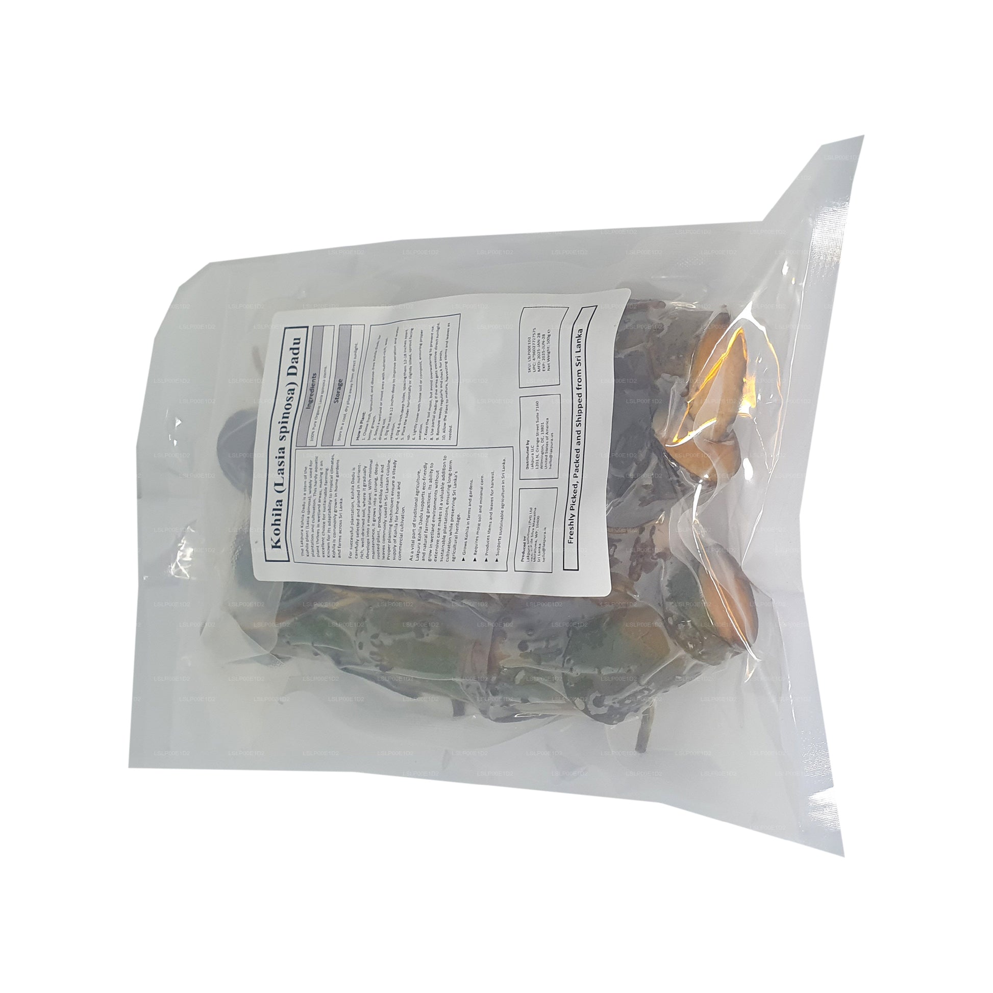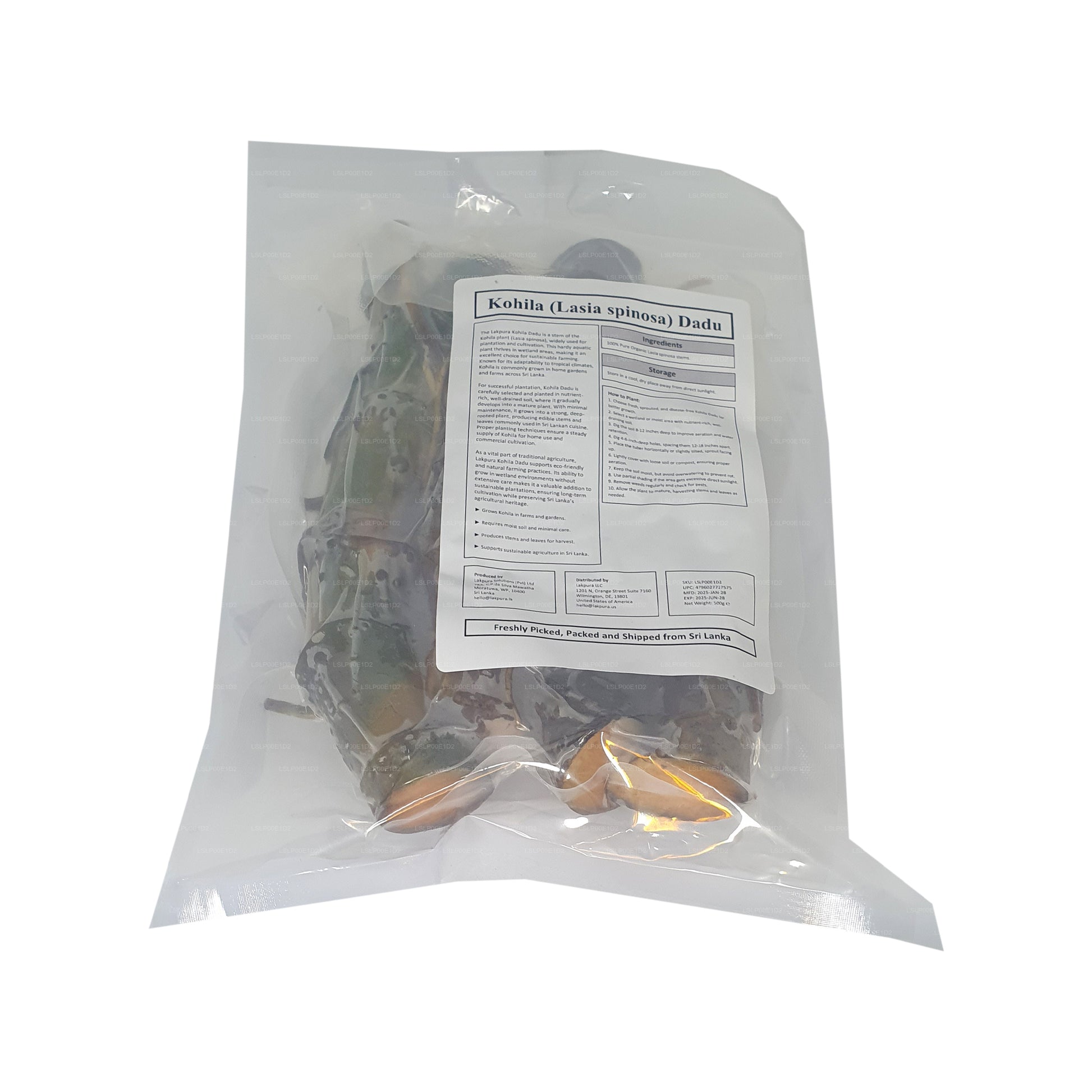 Lakpura Kohila Dadu ist ein Stamm der Kohila-Pflanze (Lasia spinosa), die für Plantagen verwendet wird. Sie gedeiht in Feuchtgebieten und wächst mit minimalem Pflegeaufwand zu einer robusten Pflanze heran, die sich ideal für nachhaltige Landwirtschaft und die traditionelle sri-lankische Landwirtschaft eignet.