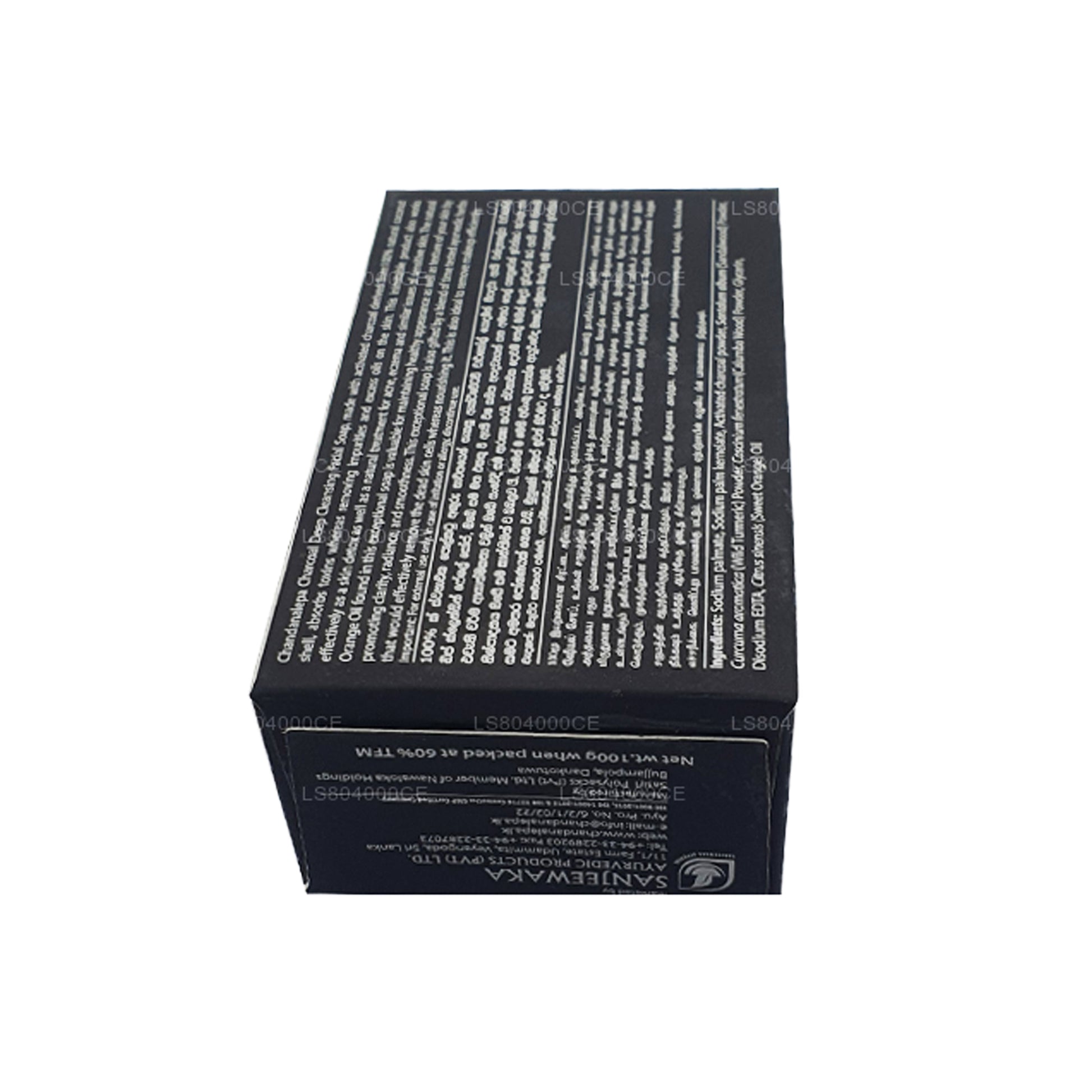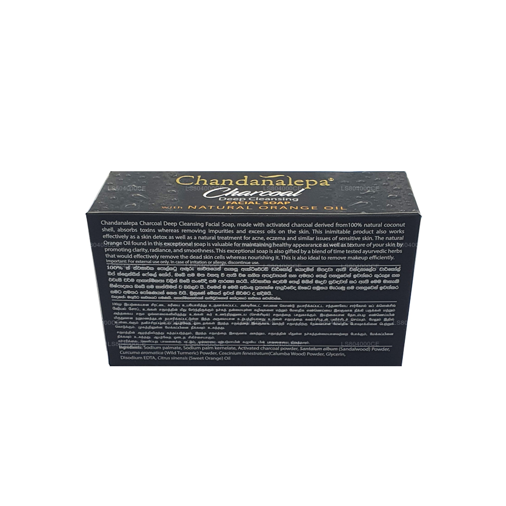 (SKU: LS804000CE) Barretta per la pulizia profonda al carbone Chandanalepa prodotta con carbone attivo derivato da gusci di cocco naturali al 100%, assorbe le tossine e rimuove le impurità e gli oli in eccesso dalla pelle. Questo prodotto unico disintossica anche la pelle con le sue proprietà curative naturali per acne, eczemi e malattie simili che affliggono la pelle sensibile. Il bouquet di erbe ayurvediche miscelate rimuove le cellule morte della pelle, nutrendo la pelle ad ogni lavaggio. L'aggiunta di olio di arancia naturale assicura che la pelle rimanga sana aggiungendo una luminosità chiara e una sensazione di morbidezza. Il sapone al carbone Chandanalepa è ideale anche per la rimozione del trucco.