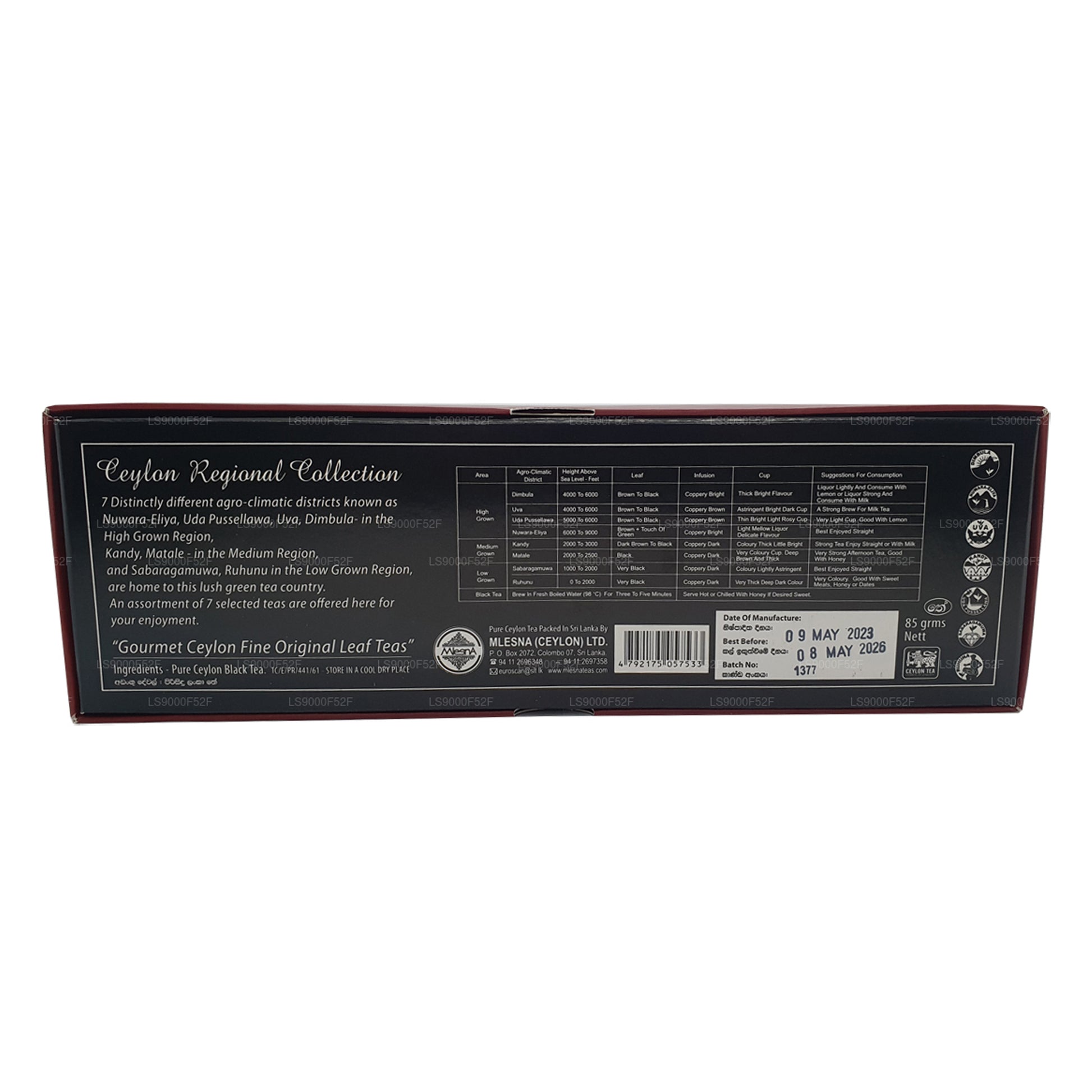 The Mlesna Ceylon Regional Collection is a premium assortment of pure Ceylon black teas sourced from seven distinctly different agro-climatic regions across Sri Lanka. These regions include Nuwara Eliya, Uda Pussellawa, Uva, Dimbula (High Grown), Kandy, Matale (Medium Grown), and Sabaragamuwa, Ruhuna (Low Grown), each contributing its own unique character and flavor profile to the collection.