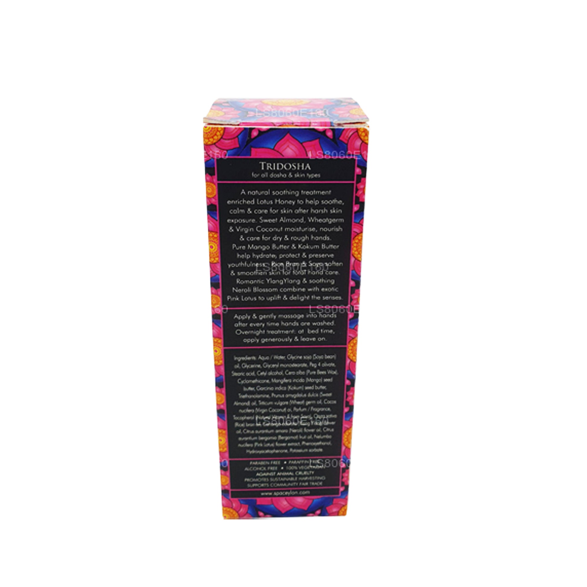 (SKU: LS8060E160) A natural soothing treatment enriched Lotus Honey to help soothe, calm & care for skin after harsh skin exposure. Sweet Almond, Wheatgerm & Virgin Coconut moisturise, nourish & care for dry & rough hands. Pure Mango Butter & Kokum Butter help hydrate, protect & preserve youthfulness. Rice Bran & Soya soften & smoothen skin for total hand care. Romantic Ylang Ylang & soothing Neroli Blossom combine with exotic Pink Lotus to uplift & delight the senses.