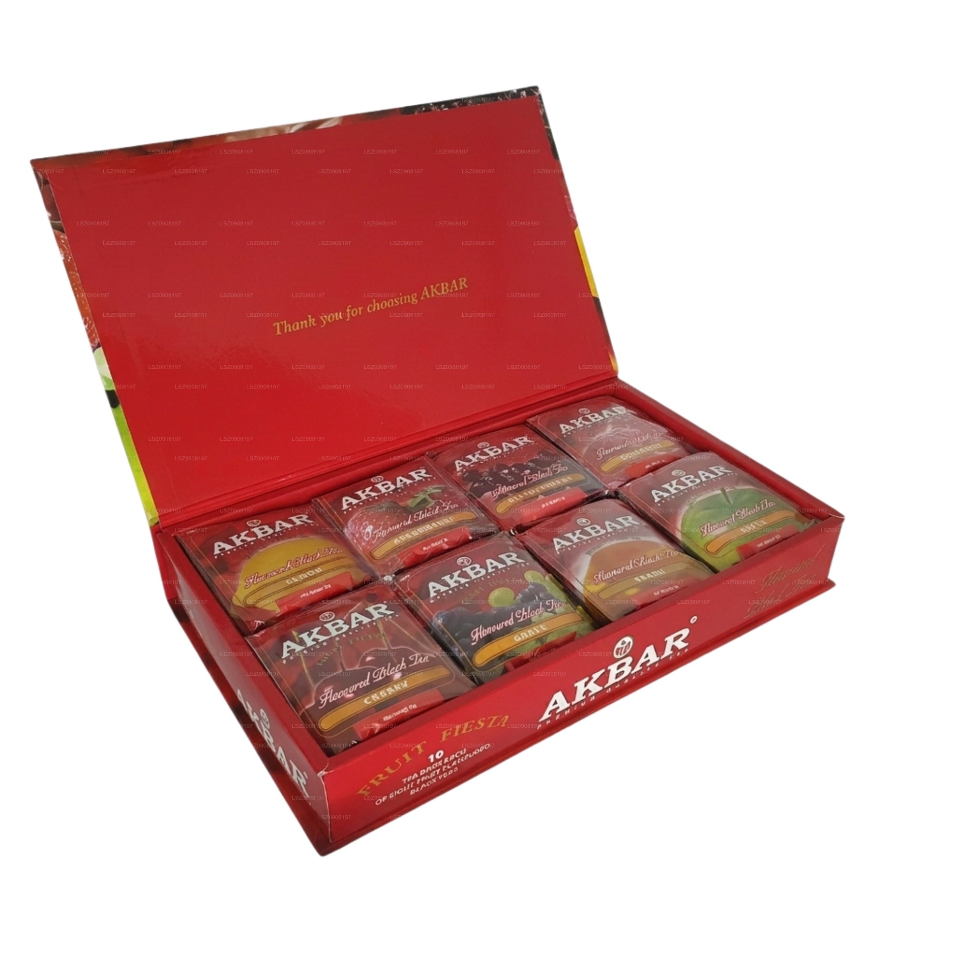 (SKU: LSZ0908197) Akbar Fruit Fiesta, aromalı siyah çay, çilek, ahududu, elma, üzüm, şeftali, limon, kiraz ve frenk üzümü olmak üzere dört enfes çay içerir. Çay koleksiyonunuza meyveli bir dokunuş katarak bu canlı ürün yelpazesinin tadını çıkarın.