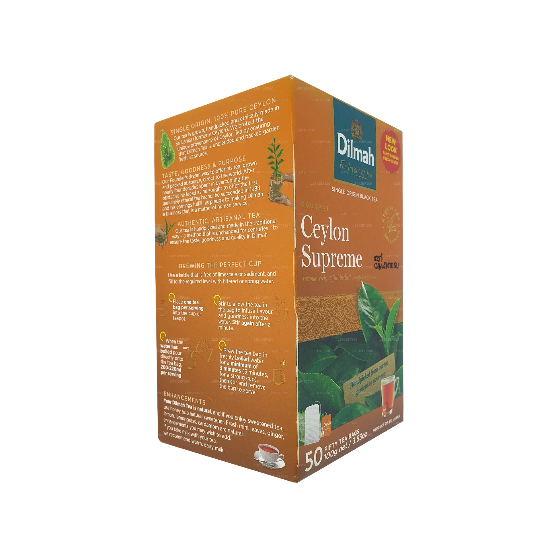 .Günün herhangi bir saatinde tüketilebilen orta kafein içerikli saf Seylan Siyah Çayı sunan bu gurme Seylan Supreme Tea, ayrı ayrı sarılmış 50 çay poşetinde gelir. Güçlü bir fincan çayın tadını çıkarmak için çay poşetini yaklaşık 5 dakika demlenmeye bırakabilirsiniz.