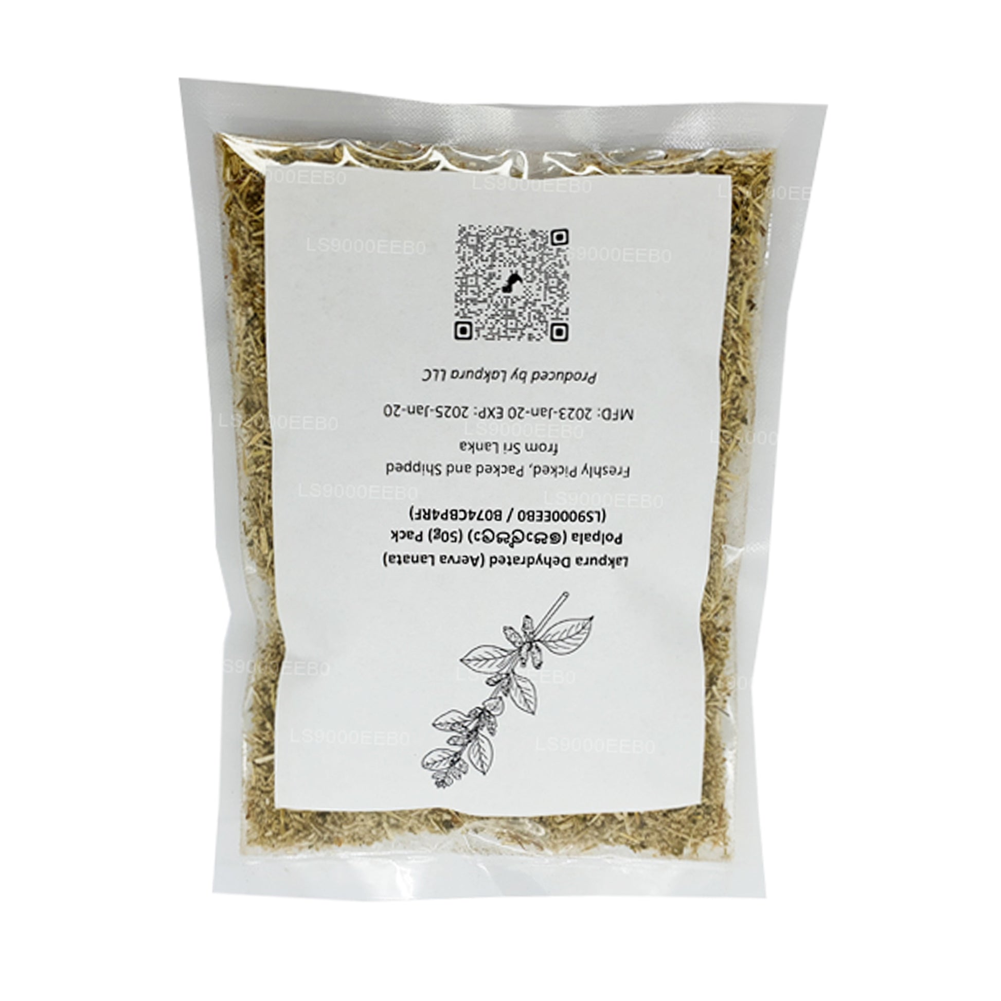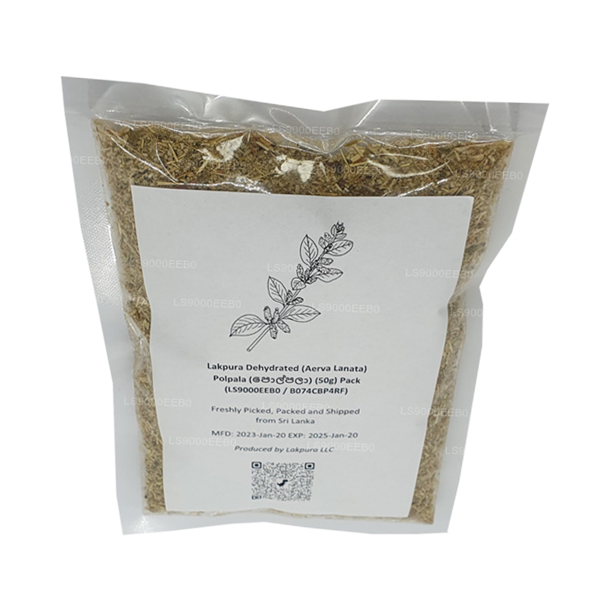 (SKU: LS4000B551) Lakpura Susuz (Aerva Lanata) Polpala (100g) Paket ~ kurutulmuş ürünler suya (30c ~ 40c) 20 ila 40 dakika daldırılarak rehidre edildiğinde, suyu emer ve hemen hemen aynı orijinal taze ürünü üretirler. renk tadı ve aroması 1 yıllık normal depolamadan sonra bile, diğer ticari kurutma yöntemleriyle elde edilemeyen bir fenomen.