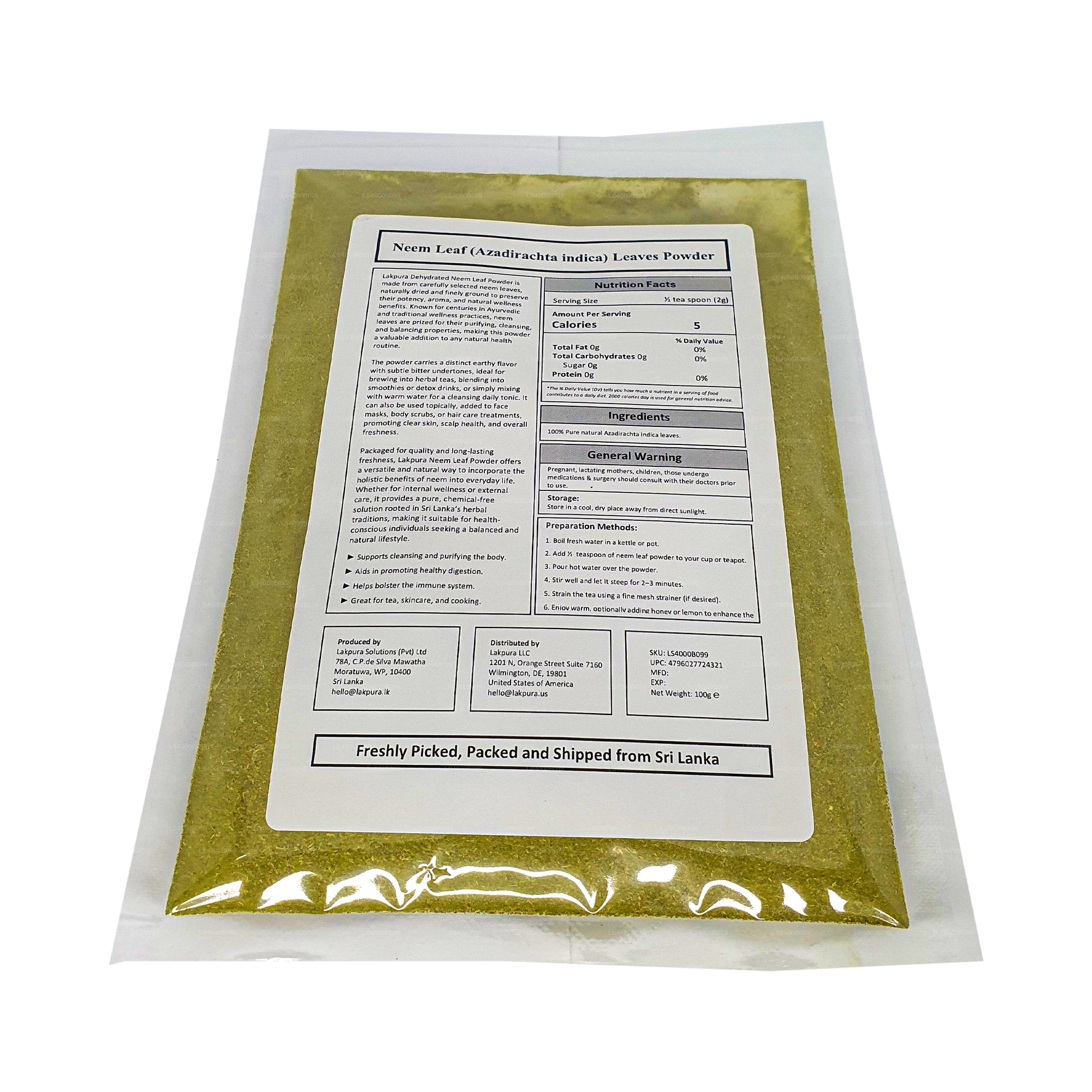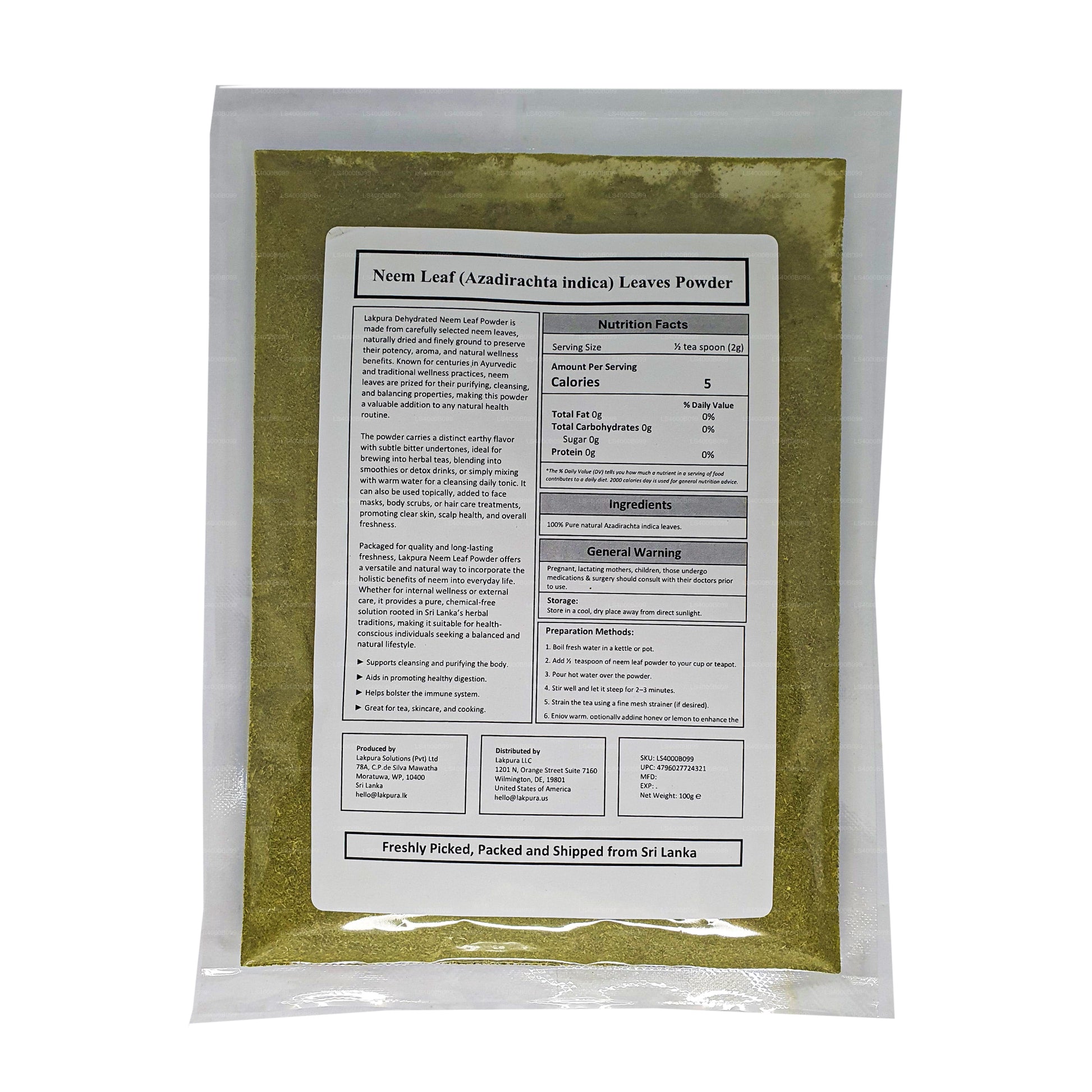 (SKU: LS4000B099) Neem yaprağı tozu Ayurveda tıbbının ayrılmaz bir parçasıdır ve pitta ve Kapha dosha'yı dengelemek ve Vata bozukluklarının tedavisinde kullanılır. Neem yaprağı tozu kanı arındırır, serbest radikal hasarıyla savaşır, toksinleri temizler, böcek ısırıklarını tedavi eder ve ülserleri iyileştirir