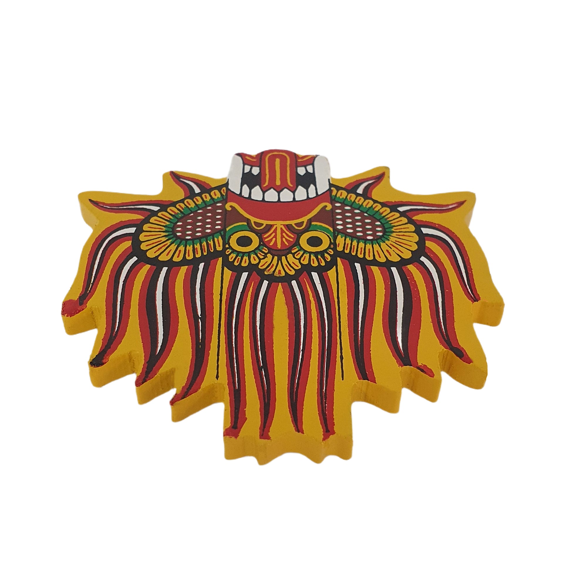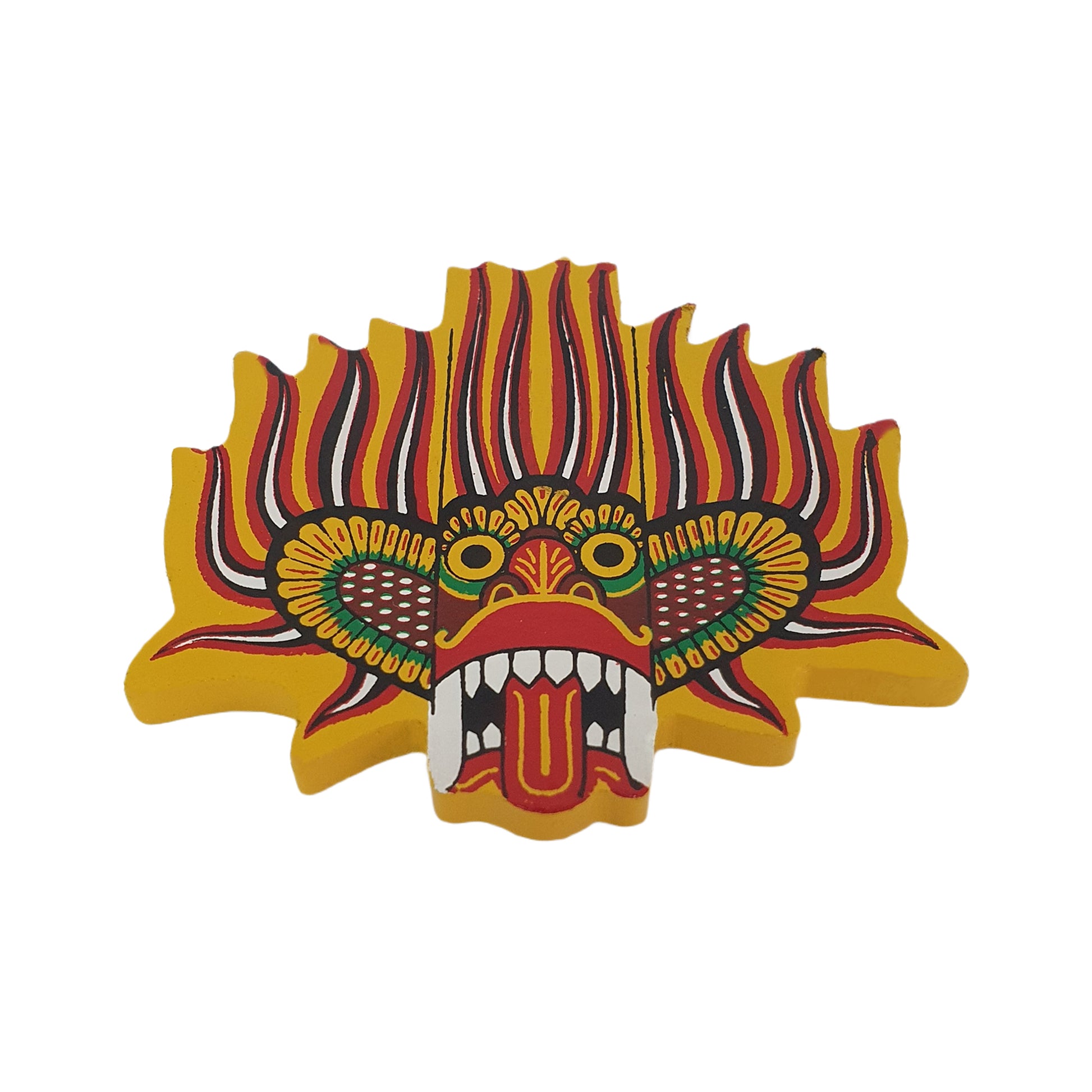 吉尼达尔·拉克沙面具 冰箱贴生动地展现了斯里兰卡传统的拉克沙面具,象征着守护和力量。吉尼达尔·拉克沙面具以其威严的表情和色彩鲜艳的细节而闻名,人们相信它可以驱散负能量,带来好运。这款迷你版面具制作精良,注重细节,展现了斯里兰卡精湛的工艺。冰箱贴的设计兼具文化传承和日常实用性,使其成为一件意义非凡的纪念品,或是您家居或办公空间的装饰品。